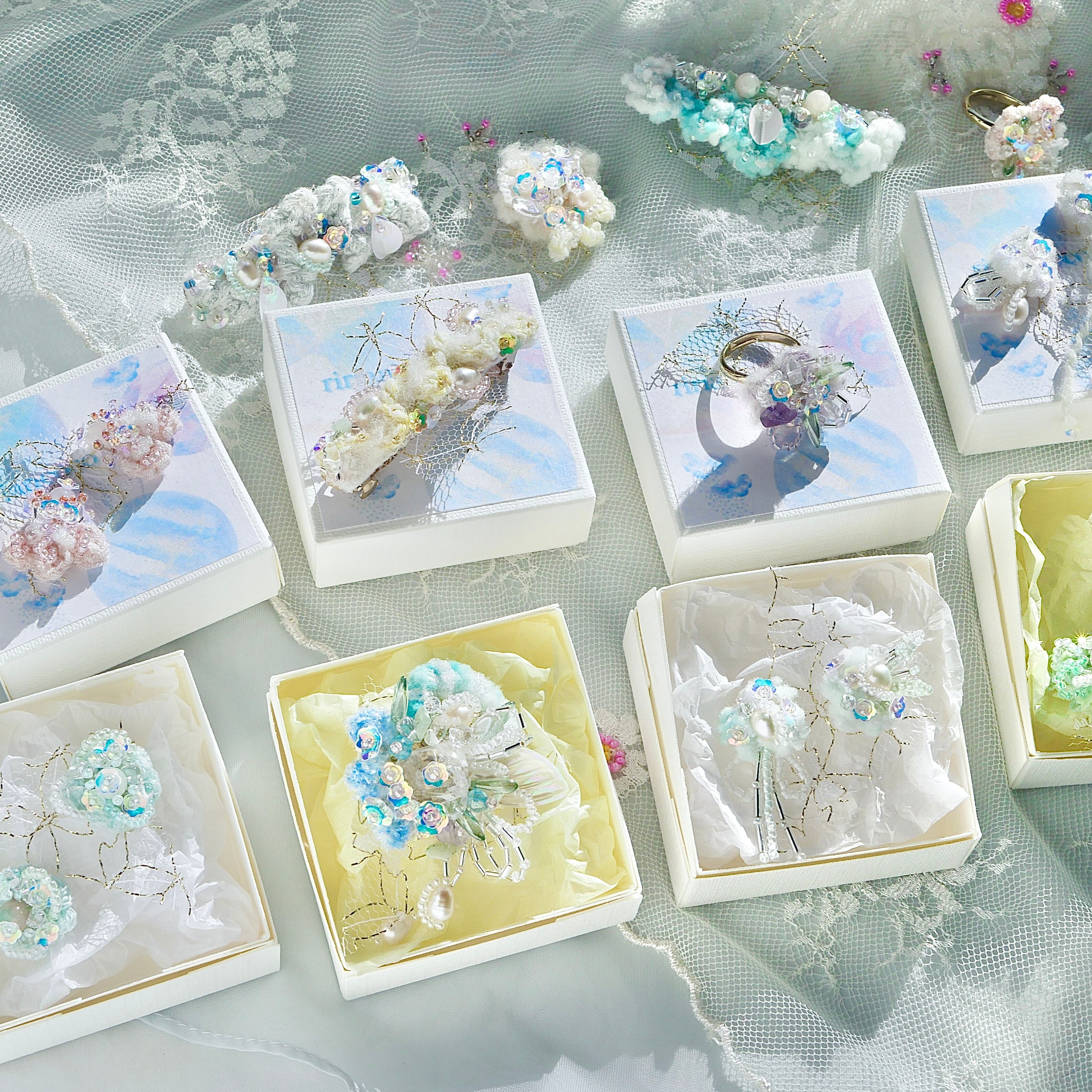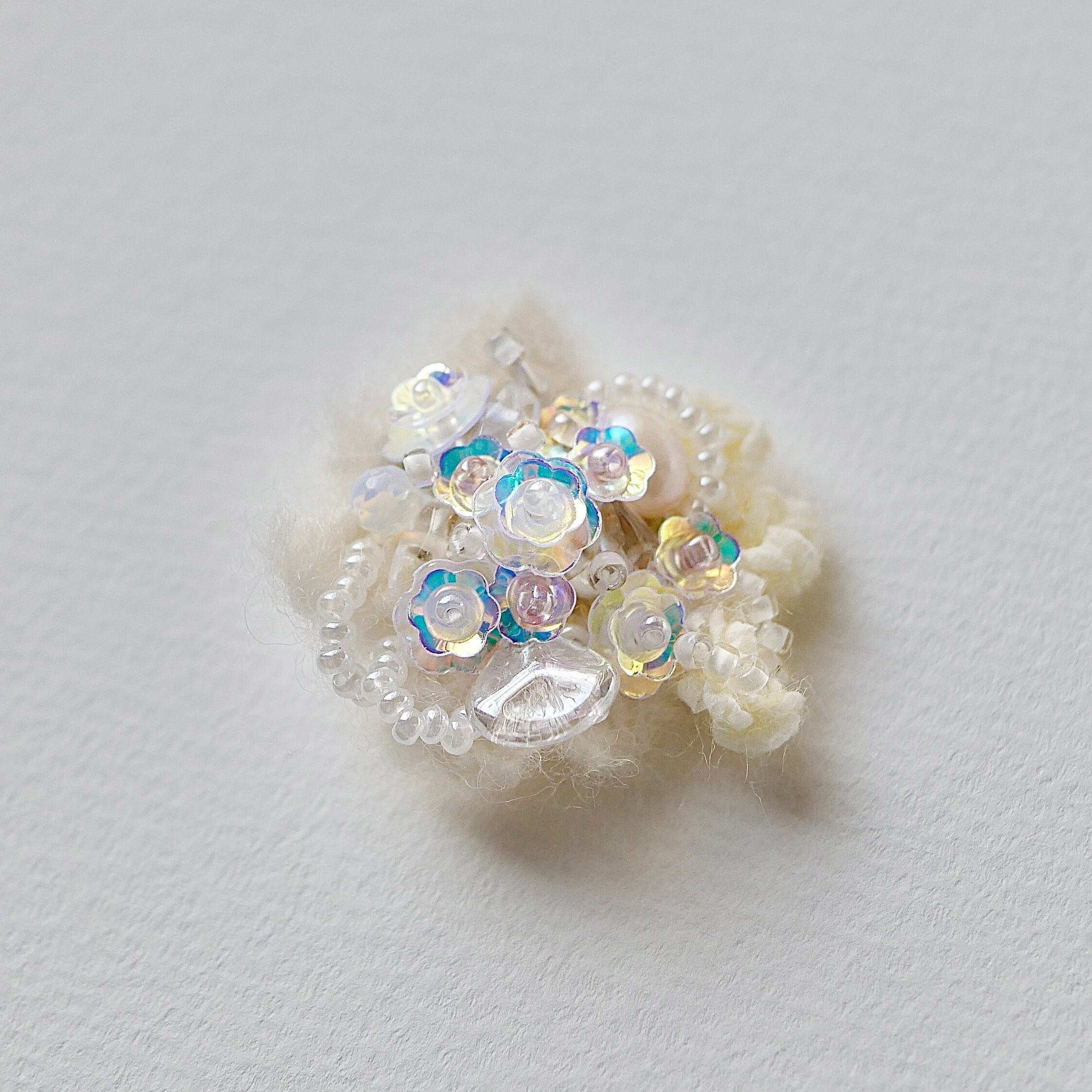 *冬の海*をテーマに光を反射したキラキラとした水面や海の泡、白いサンゴのイメージを詰め込んだブローチを作りました。