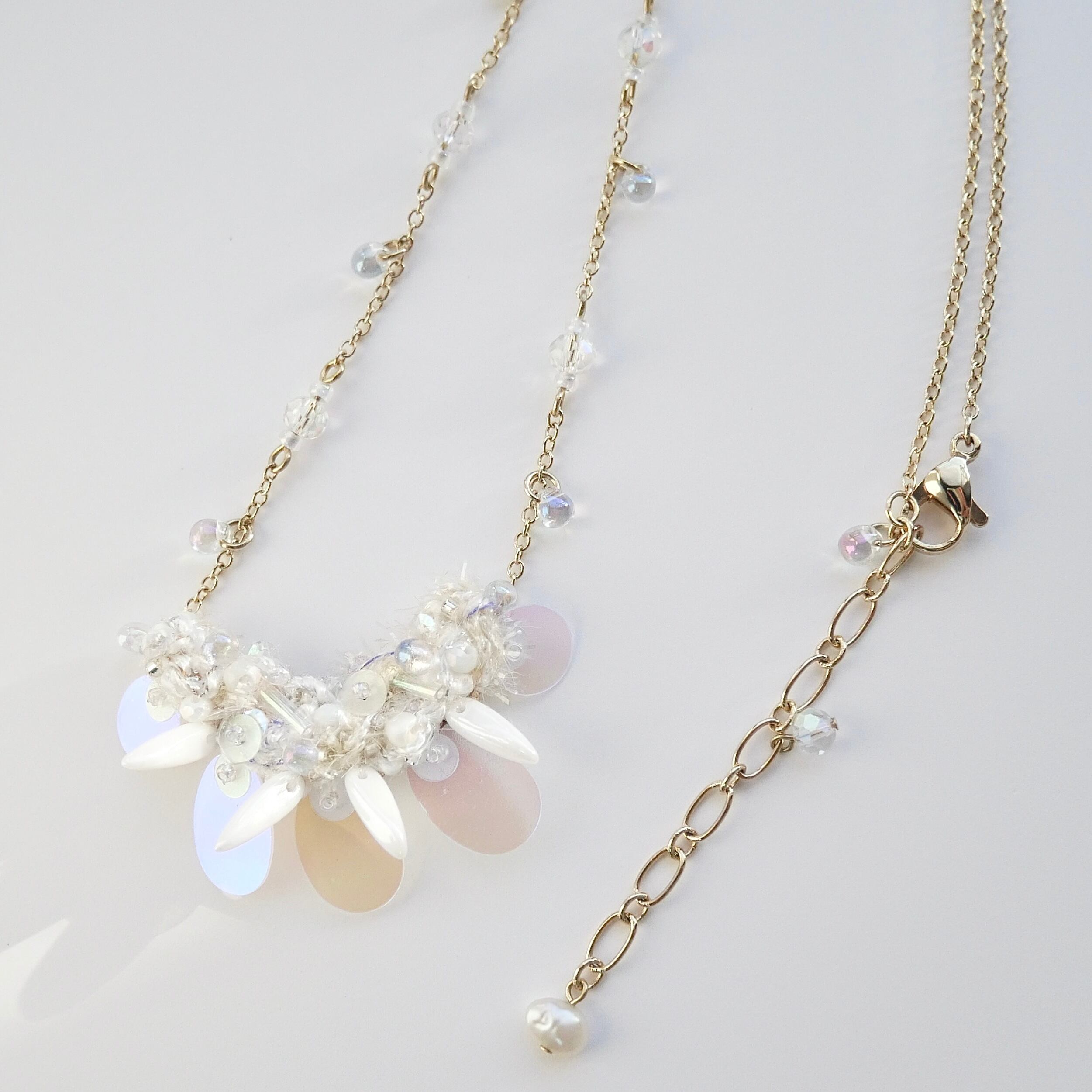 光を反射したキラキラとした水面や、海の泡、砂浜に広がる貝殻やサンゴのイメージをギュッと詰め込んだネックレスを作りました。
