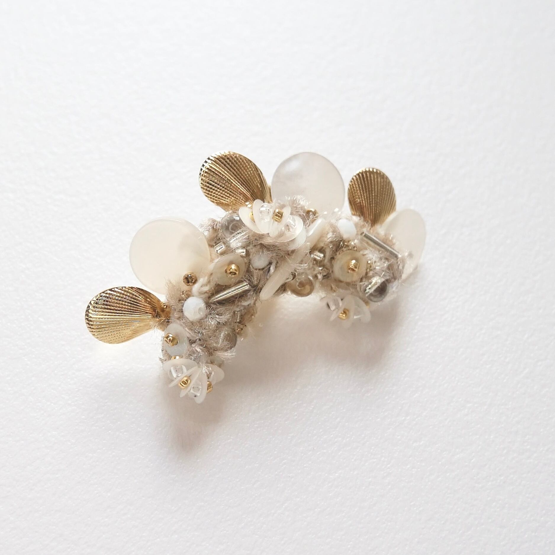編んだ糸の上に、ガラスビーズやスパンコール、チャームを縫い付けウミウシの模様に見立てました。